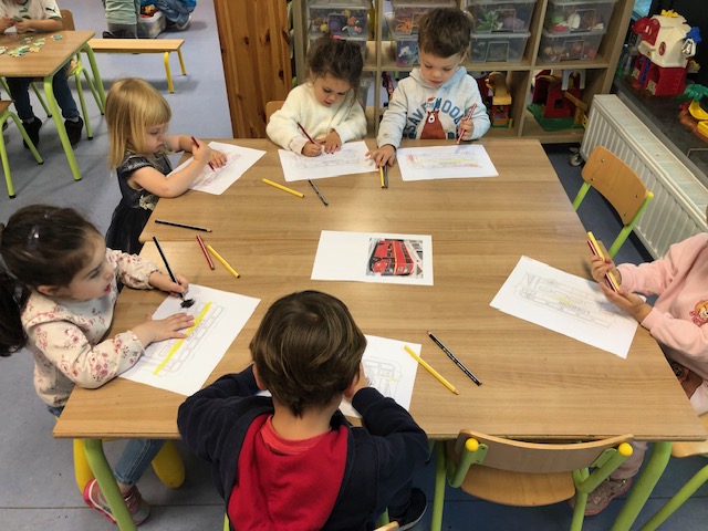 En éveil aux langues, nous avons découvert l’anglais au Royaume-Uni. Nous avons cherché ce pays sur la carte (qui se trouve de l’autre côté de la mer). Nous avons regardé son drapeau et nous nous sommes rendu compte qu’il y avait des mots semblables aux nôtres, comme « t-shirt », « puzzle » ou « cowboy ». Nous avons aussi parlé du célèbre bus anglais à deux étages et partagé nos impressions.