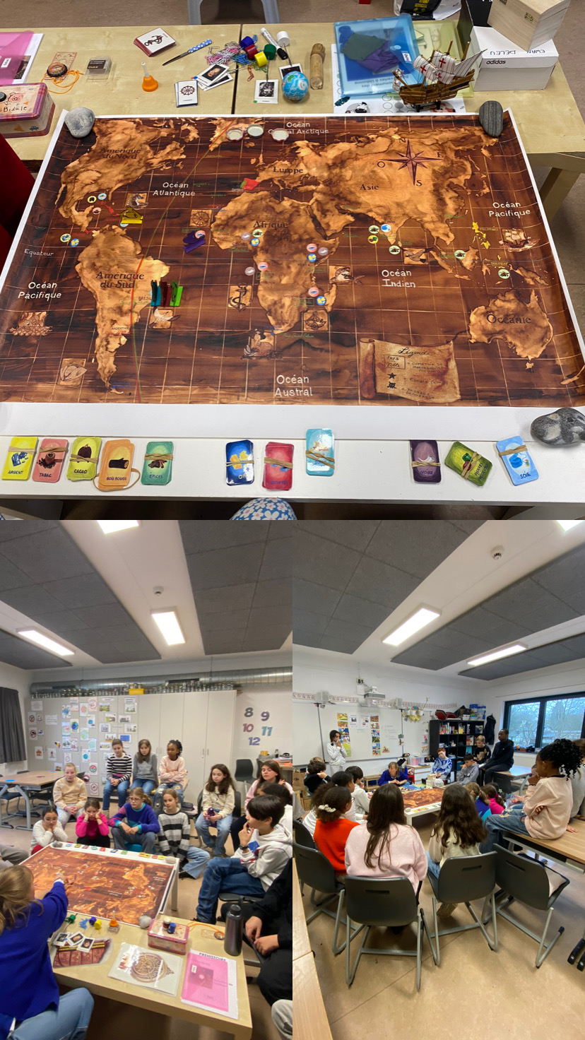 Pour rendre l’apprentissage vivant et ludique, les enfants ont joué sur un grand plateau de jeu interactif. Ils ont dû faire des choix comme Magellan : choisir les bons tissus, sélectionner les aliments adaptés au voyage, et relever différents défis tout au long du parcours.